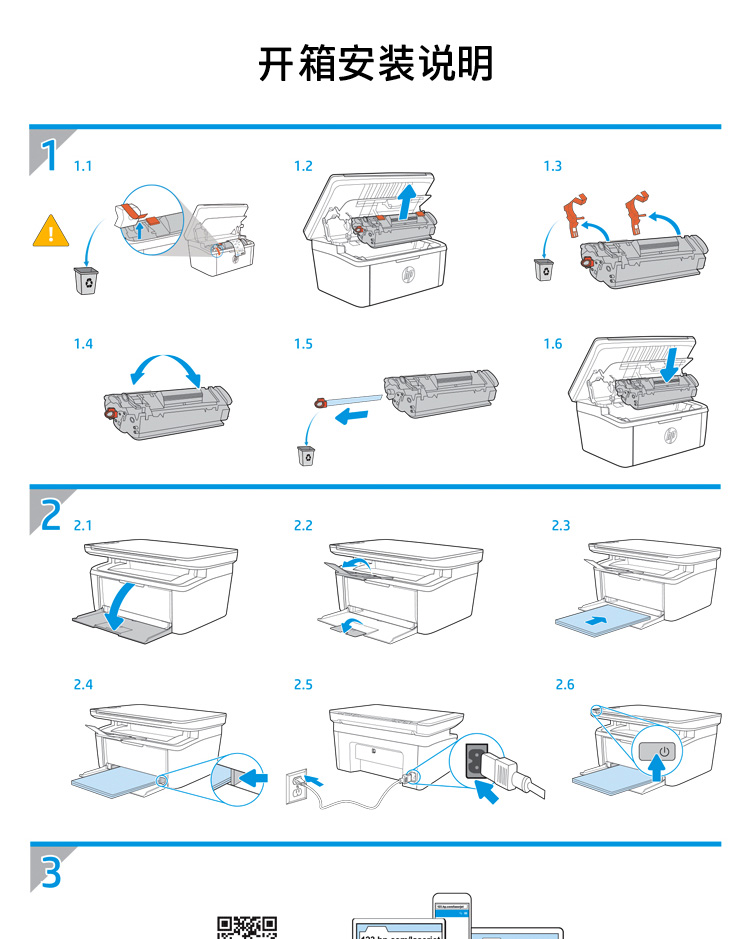 包装清单  :   HP LaserJet Pro M30w激光打印机*1、预装惠普原装黑色启动硒鼓*1、入门指南*1、安装海报*1、保修指南*1、电源线*1、USB数据线*1