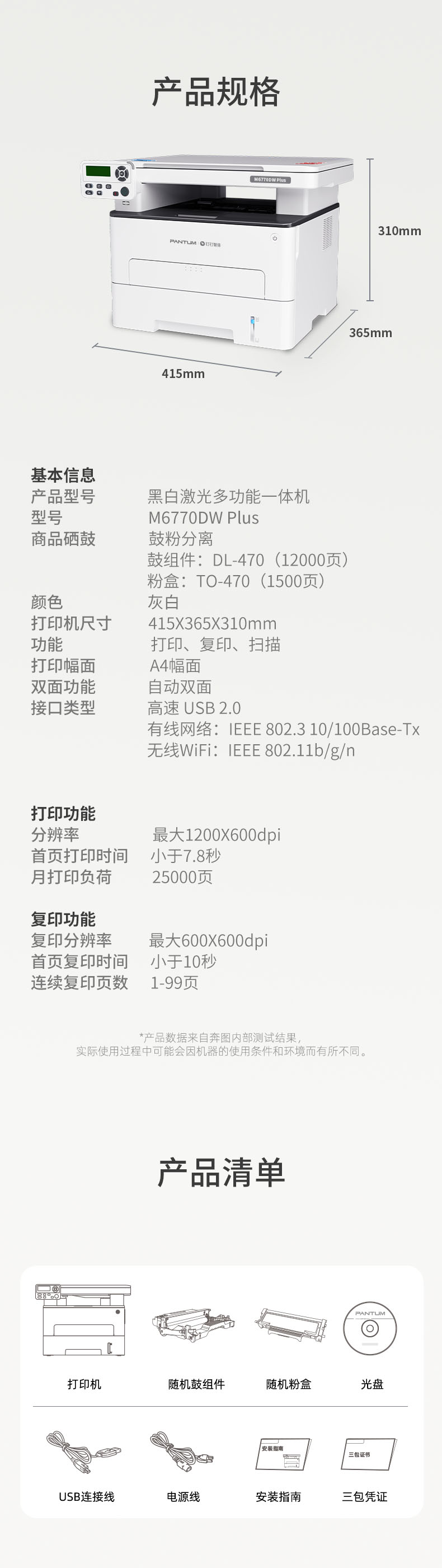 包装清单  :   打印机 x1,随机鼓组件 x1,随机粉盒 x1,驱动光盘 x1,电源线 x1,USB连接线 x1,三包凭证 x1,快速安装指南 x1