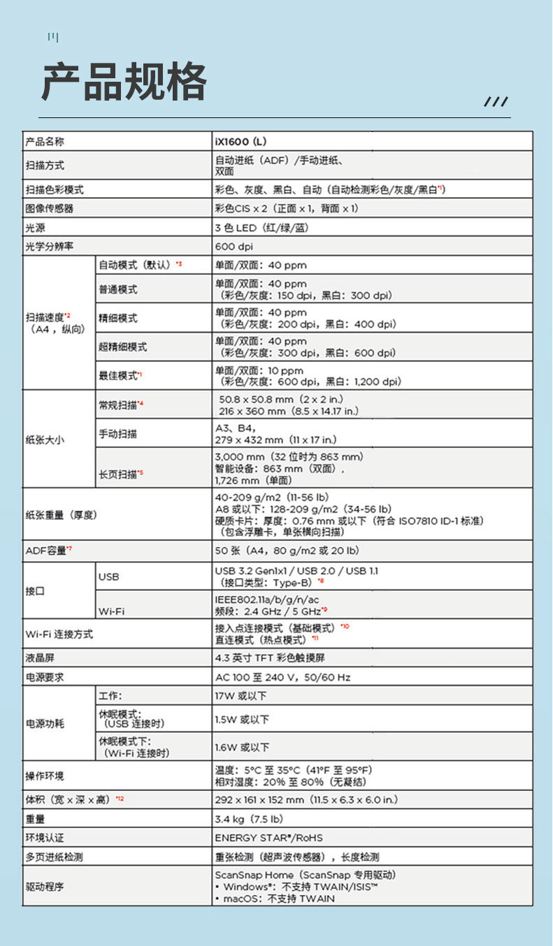 ADF彩色双面扫描速度(A4,200dpi)  :   无
