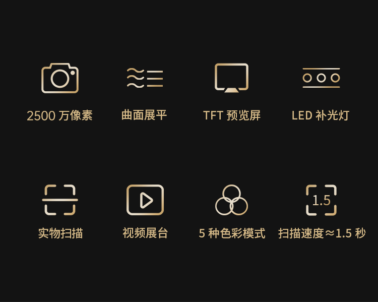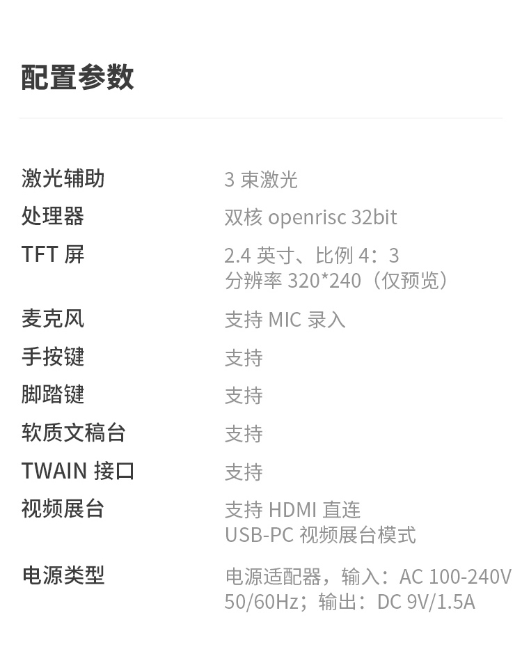 包装清单  :   设备主体、数据线、电源适配器、手按键、脚踏键、软质文稿台、专用指套、光盘、《入门指南》、质保卡