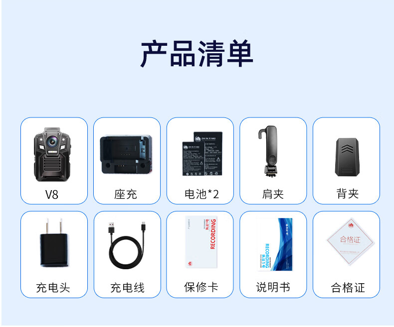 包装清单  :   执法记录仪*1 电池*2 座充*1