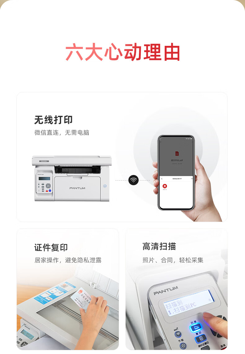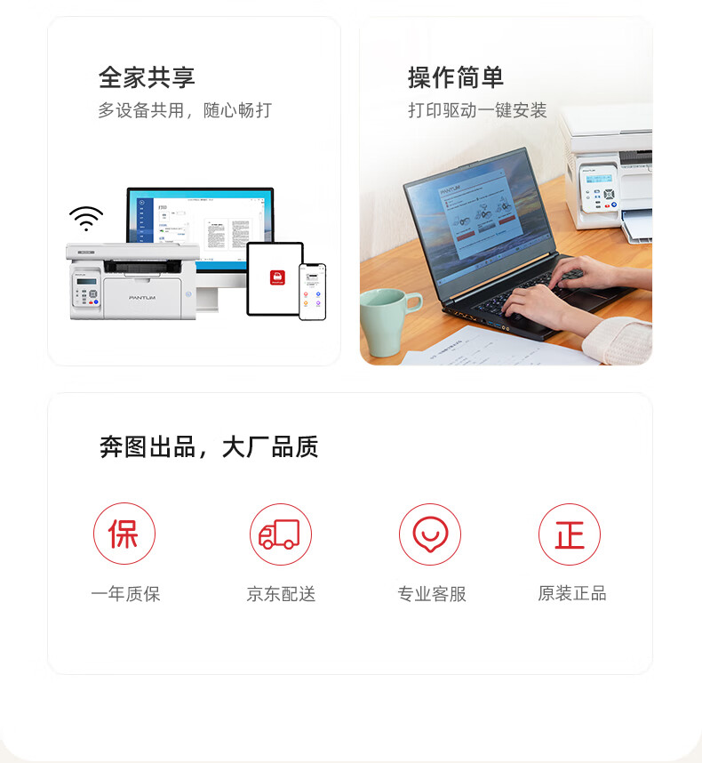 包装清单  :   打印机×1,硒鼓×1,电源线×1,USB连接线×1,快速安装指南×1,三包凭证×1