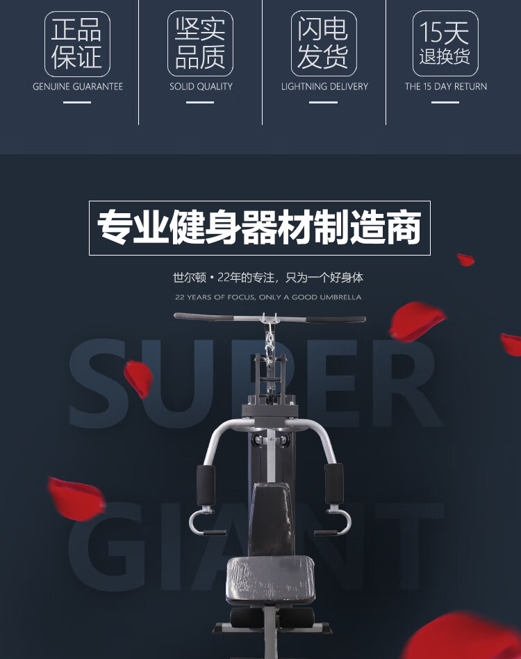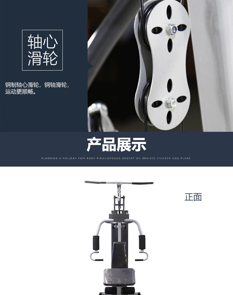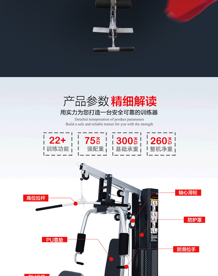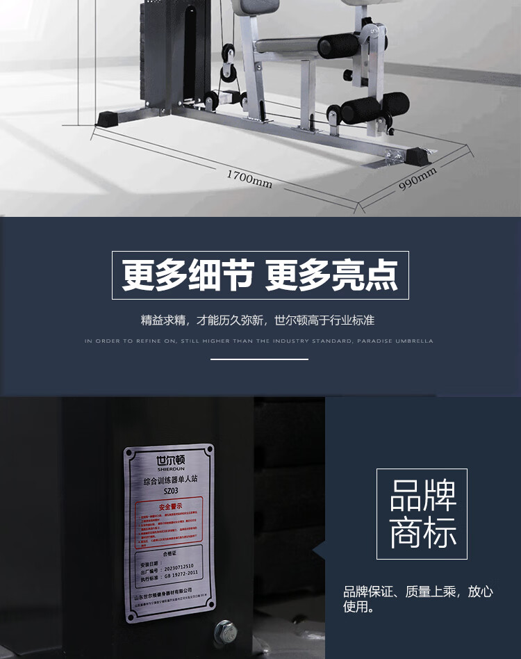 11.主要功能:坐姿推举、站姿弯举、站姿提拉、坐姿颈后拉、站姿胸前下压、坐姿腿屈伸、站姿腿外展、站姿腿弯举、扩胸等功能