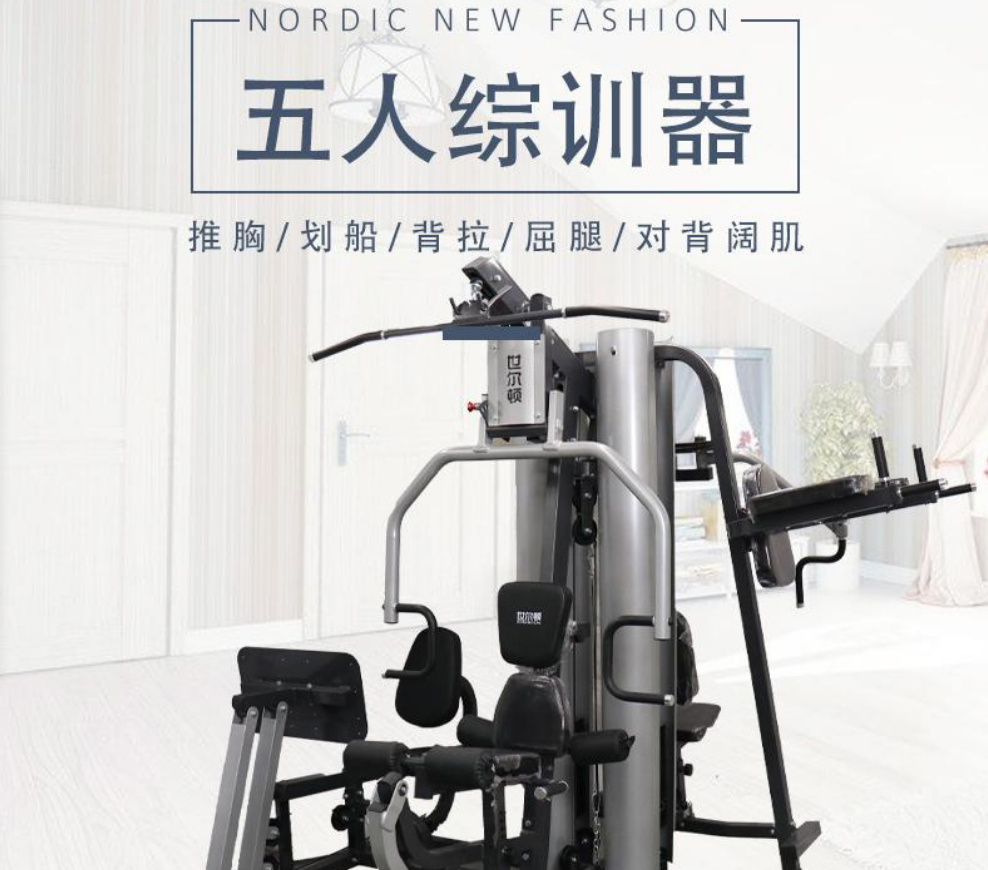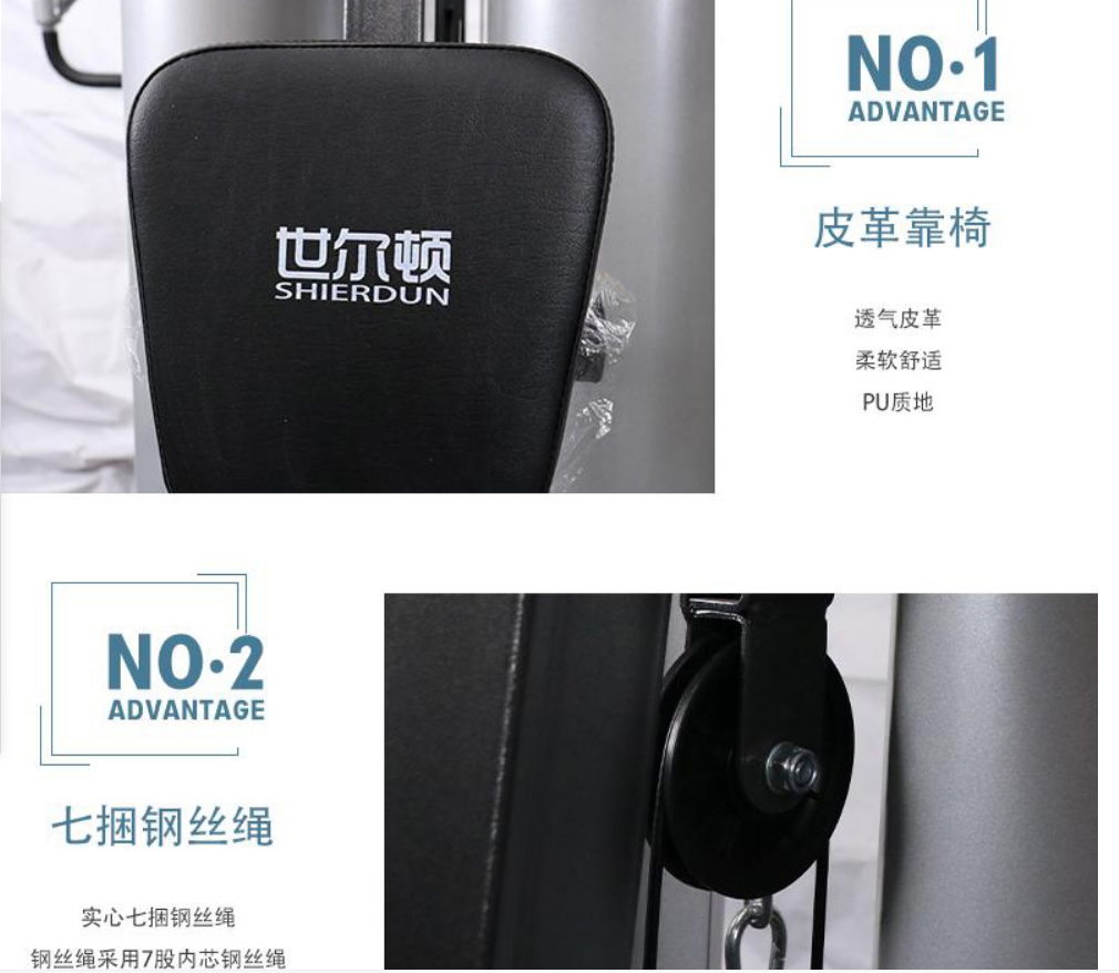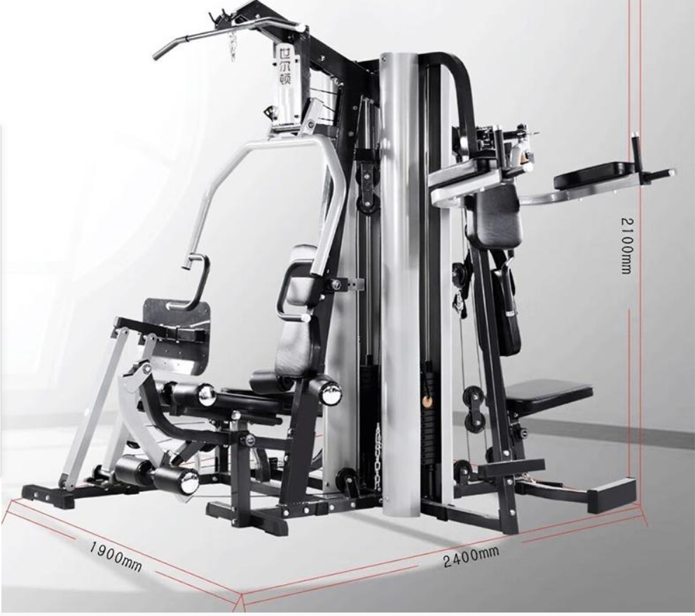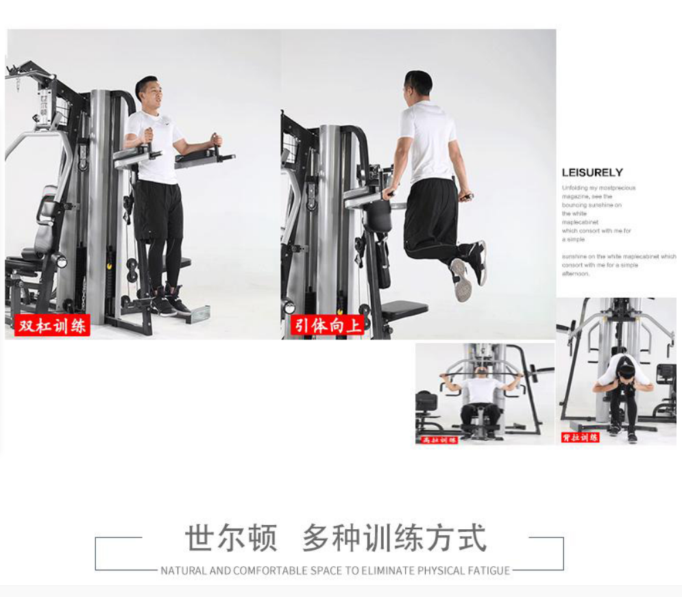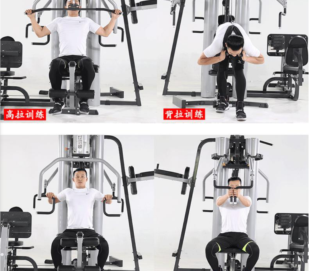 主要功能:推胸(可调)、前踢腿、侧踢腿、划船、高低拉、直臂下拉、蝴蝶夹胸(可调)、背拉、屈腿、单手侧提拉、坐姿蹬腿、双杠、提膝等,以上功能可满足不同角度和部位的训练,对背阔肌、胸肌、腿部、二三头肌和三角肌有很好的锻炼