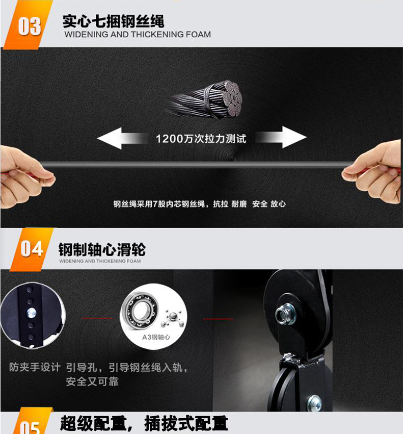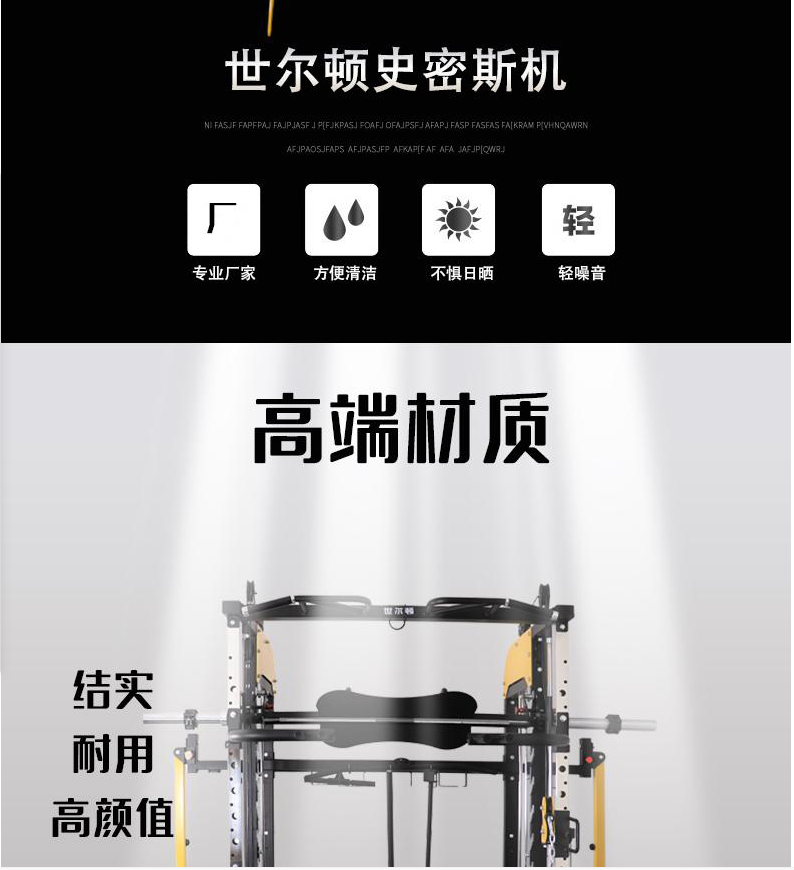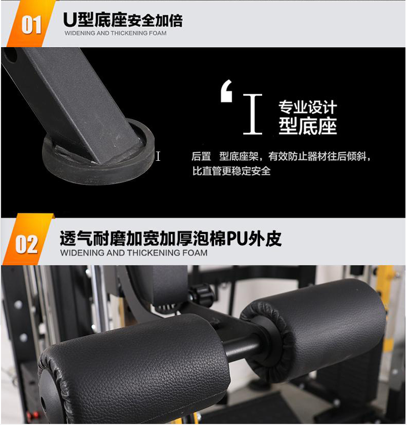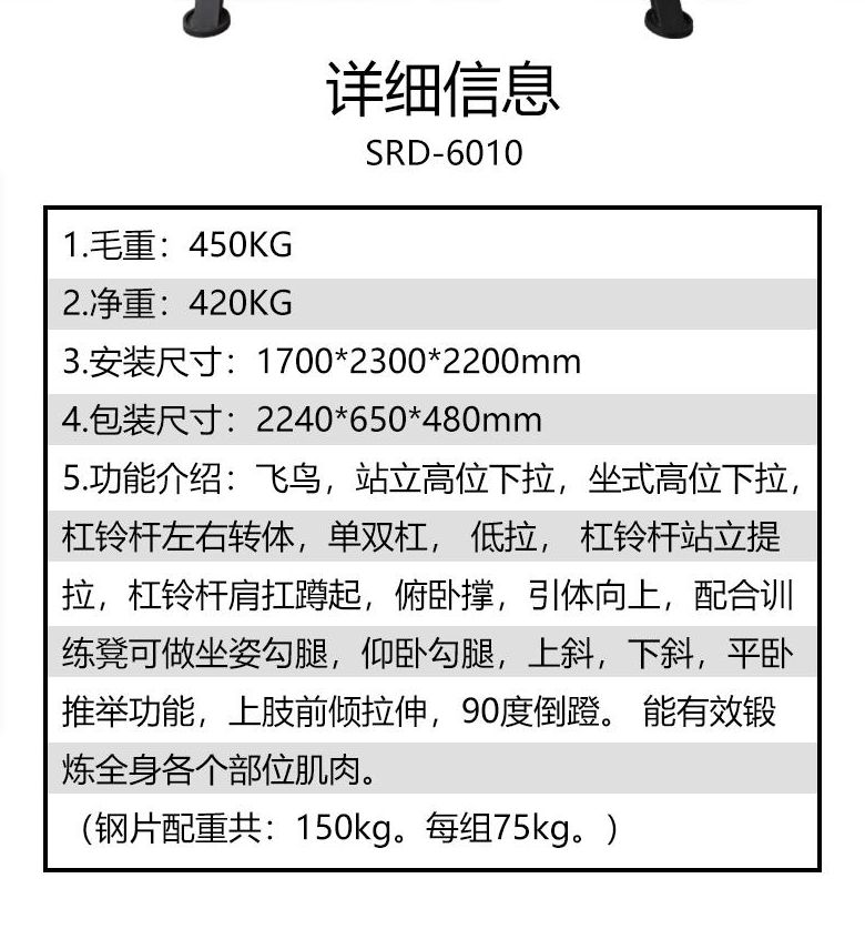 5.功能介绍:飞鸟,站立高位下拉,坐式高位下拉,杠铃杆左右转体,单双杠, 低拉, 杠铃杆站立提拉,杠铃杆肩扛蹲起,俯卧撑,引体向上,配合训练凳可做坐姿勾腿,仰卧勾腿,上斜,下斜,平卧推举功能,上肢前倾拉伸,90度倒蹬。 能有效锻炼全身各个部位肌肉。 (钢片配重共:150kg。每组75kg。)