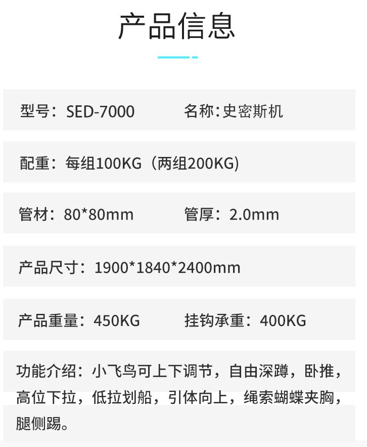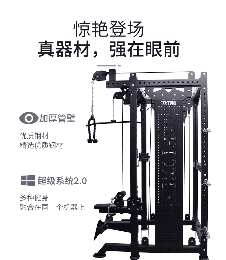9.功能介绍:小飞鸟可上下调节,自由深蹲,卧推,高位下拉,低拉划船,引体向上,绳索蝴蝶夹胸,腿侧踢