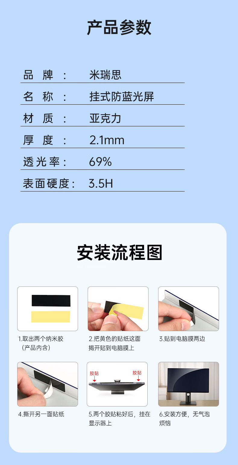 包装清单  :   22英寸防蓝光膜*1 酒精包*1 清洁布*1