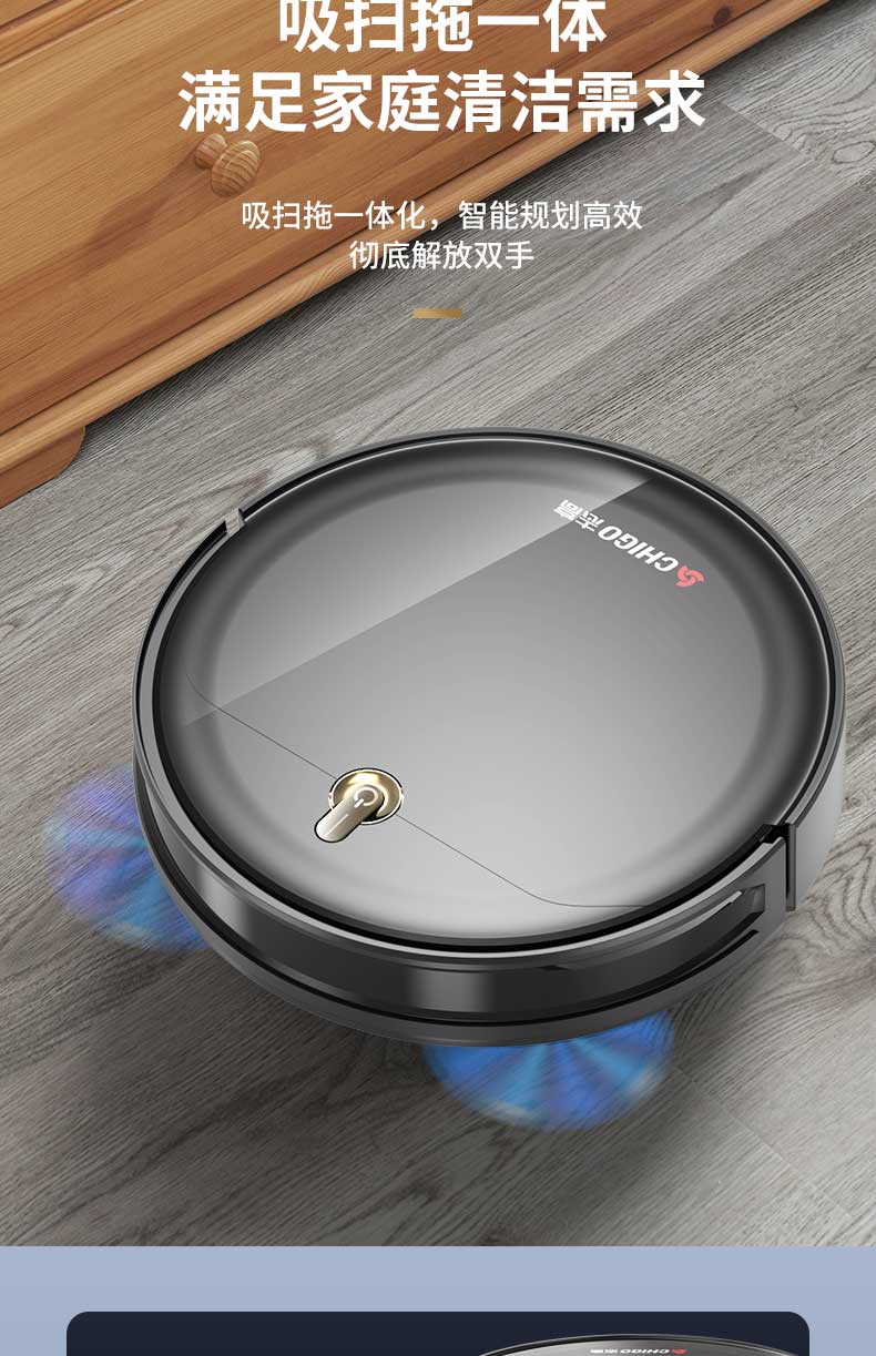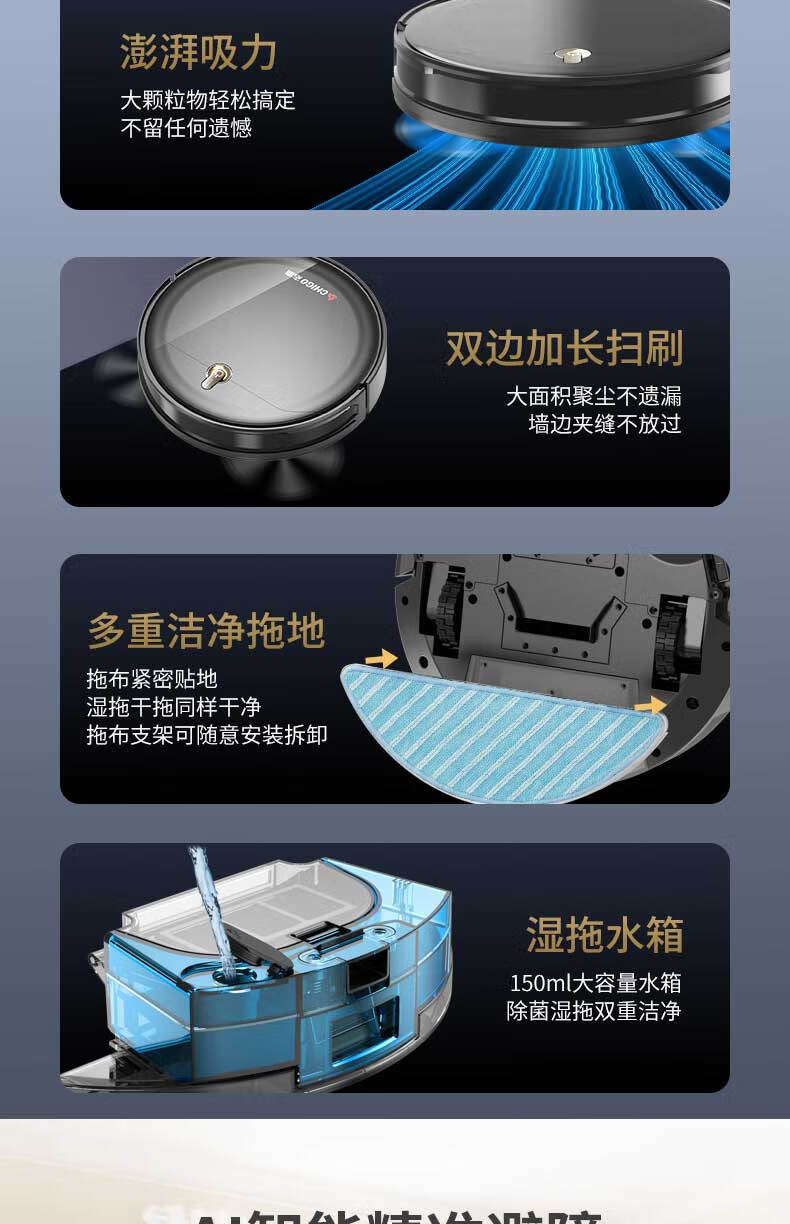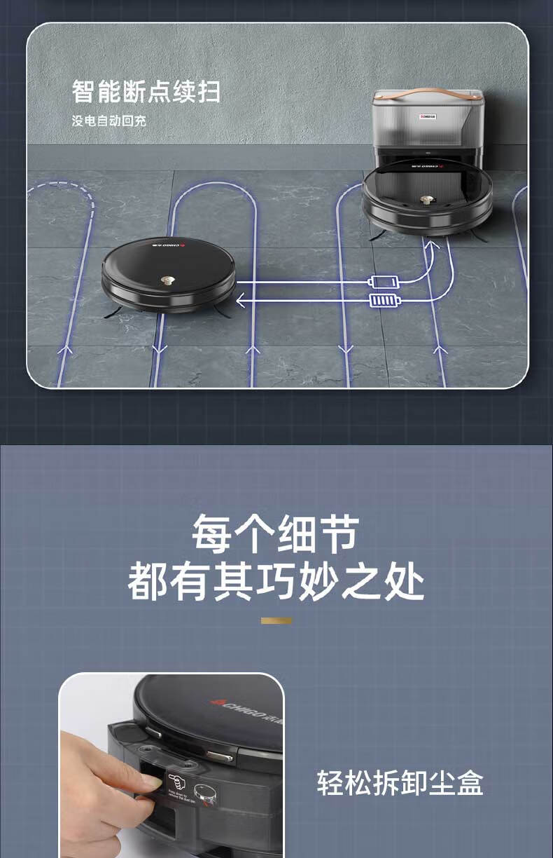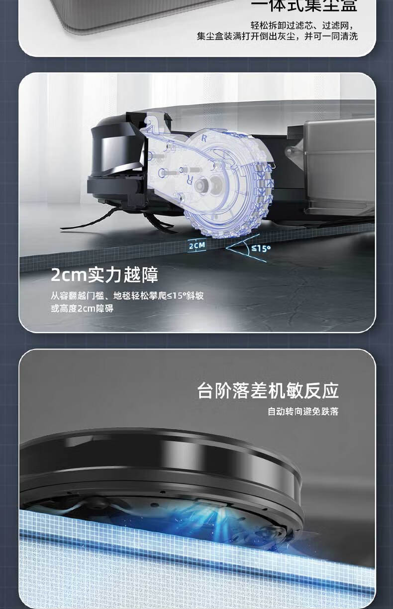 带手机涂鸦APP;带自动充电功能;带遥控器:带智能所点续扫:带智能集尘,可装2.5L垃圾:带陀螺仪路线规划行一行清洁:带水箱湿拖(水箱里可以加消毒水):耐用锂电池2600MA