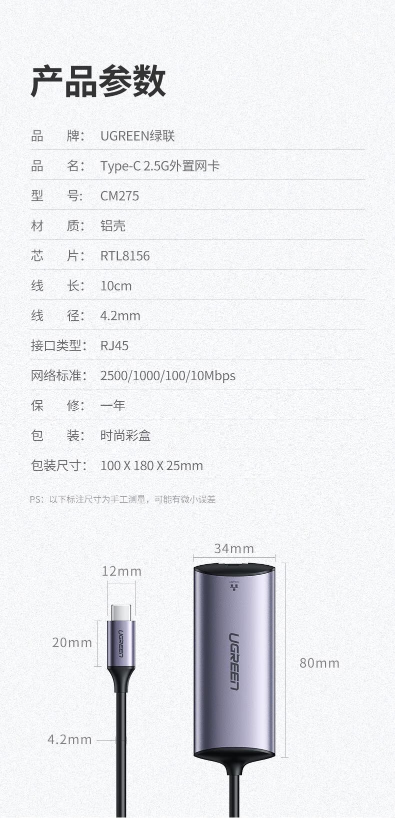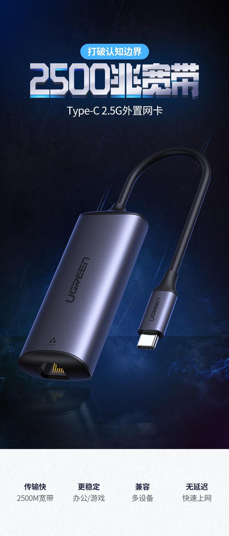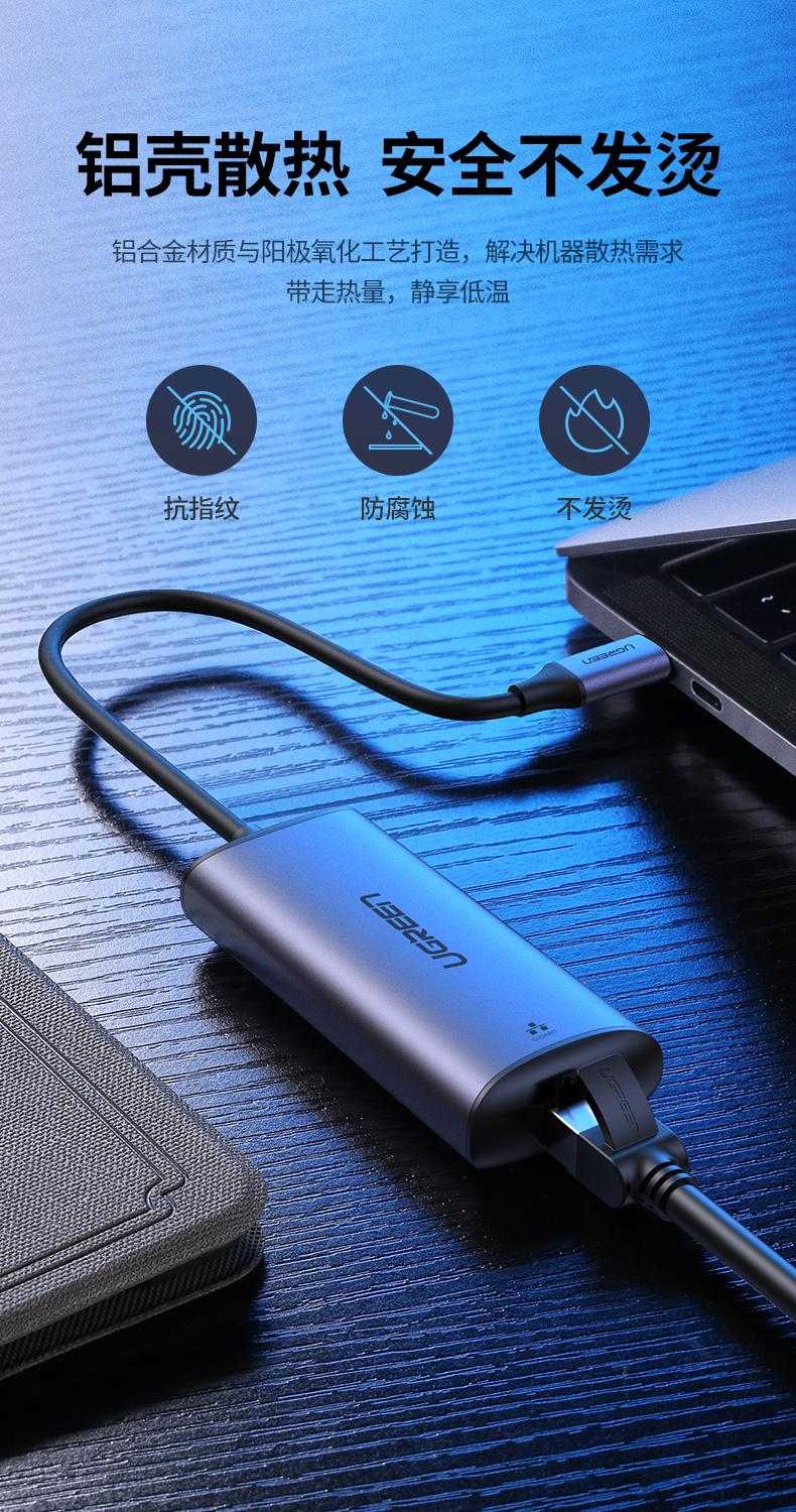 绿联/UGREEN CM275 网络连接设备 Type-C转RJ45 2.5G千兆网卡 USB3.0转RJ45 2.5G网卡 USB 深空灰