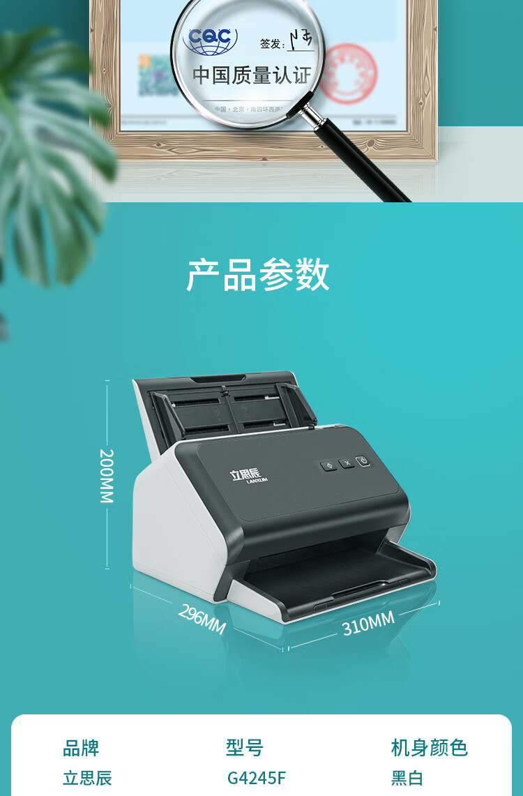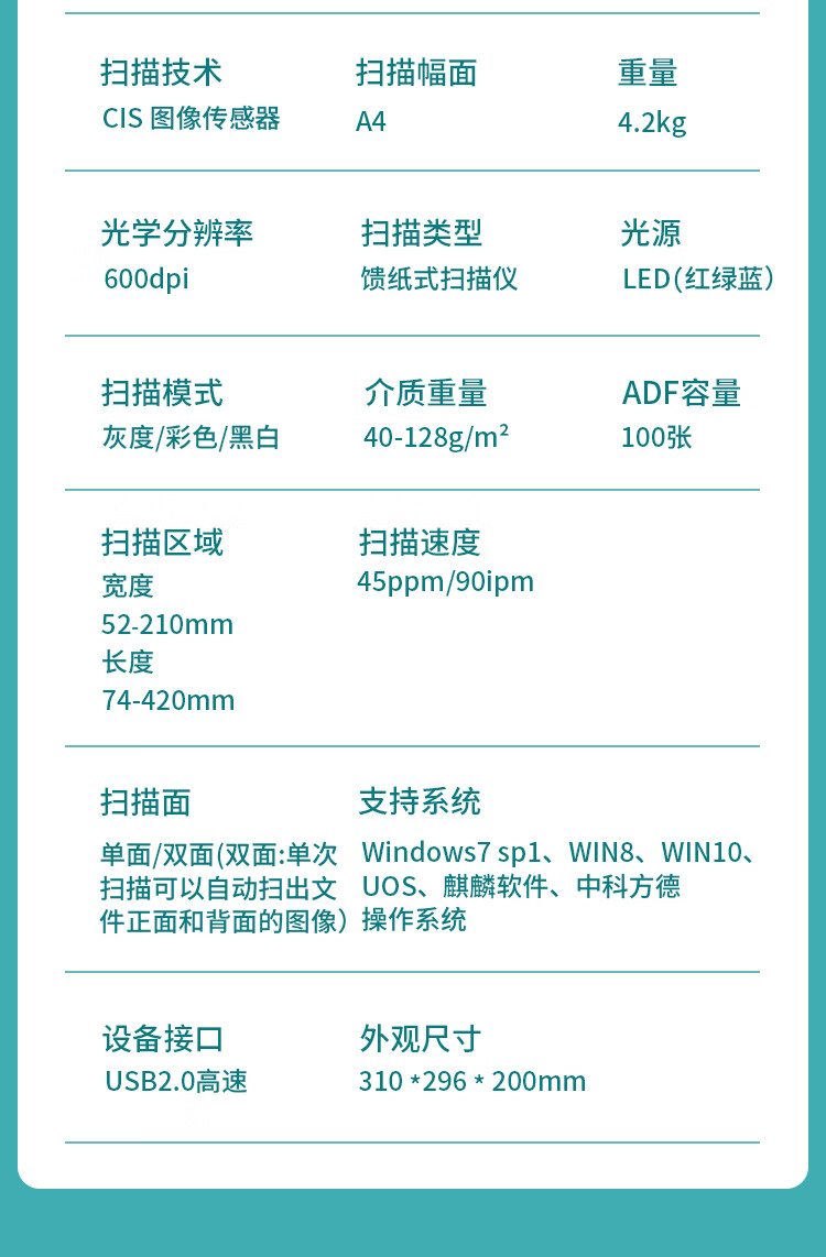 ADF彩色双面扫描速度(A4,200dpi)  :   90