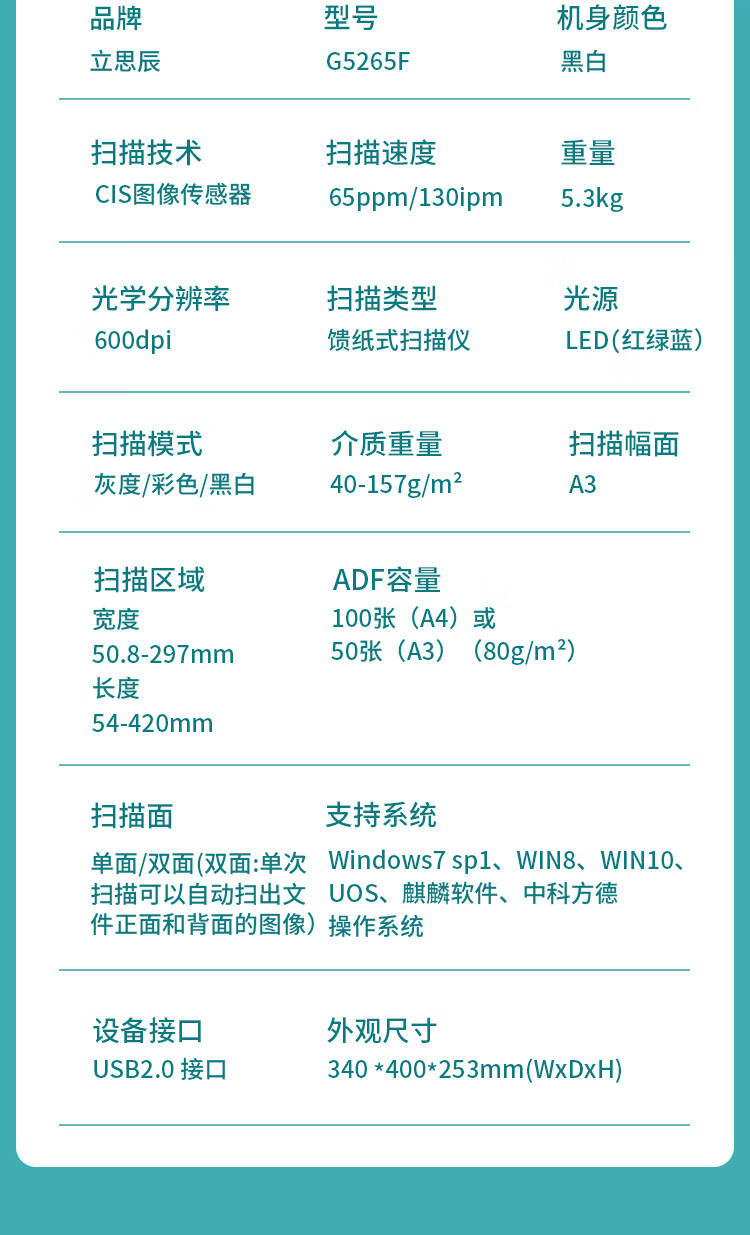 ADF彩色双面扫描速度(A4,200dpi)  :   130