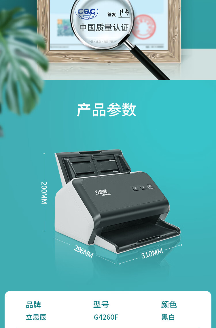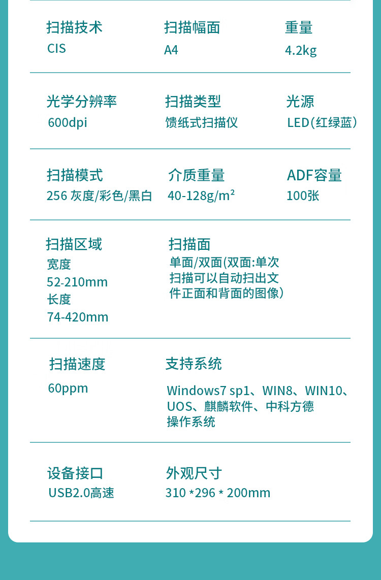 ADF彩色双面扫描速度(A4,200dpi)  :   120