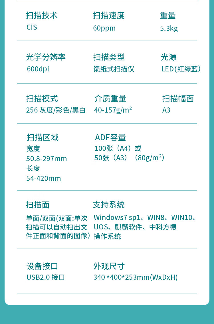 ADF彩色单面扫描速度(A4,200dpi)  :   60
