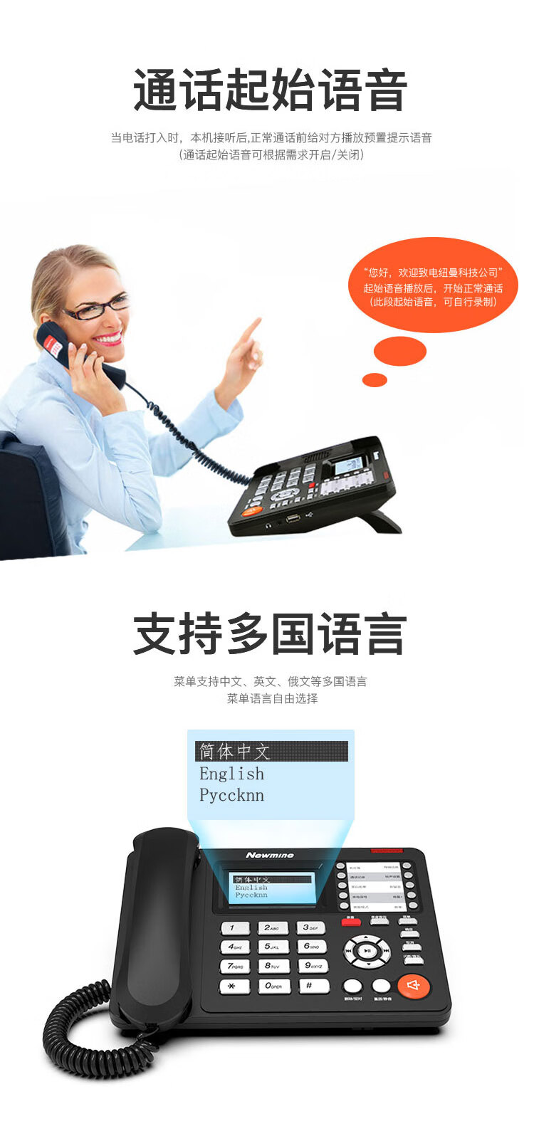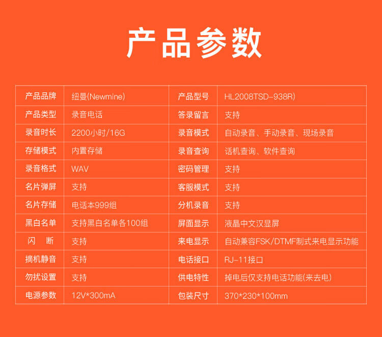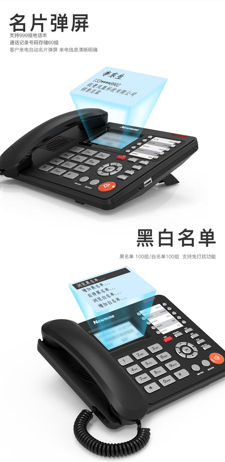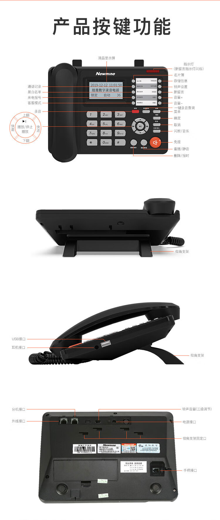 包装清单  :   电话机*1,适配器*1,USB连接线*1,电话线*1,手柄曲线*1,驱动光盘*1,产品维修手册*1,使用说明书*1,合格证*1