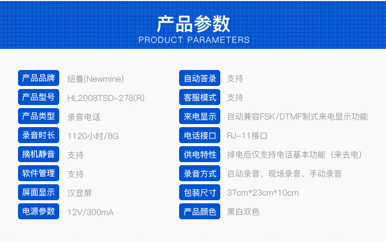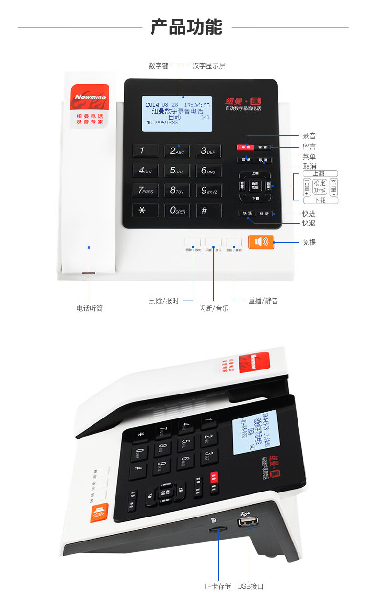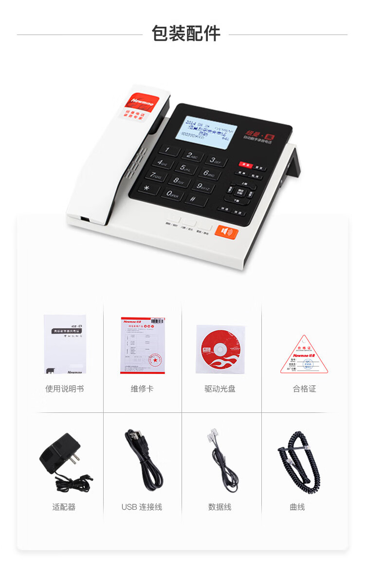 包装清单  :   电话机x1,电话线x1,手柄x1,手柄线x1,说明书x1,保修卡x1,合格证x1,电源x1