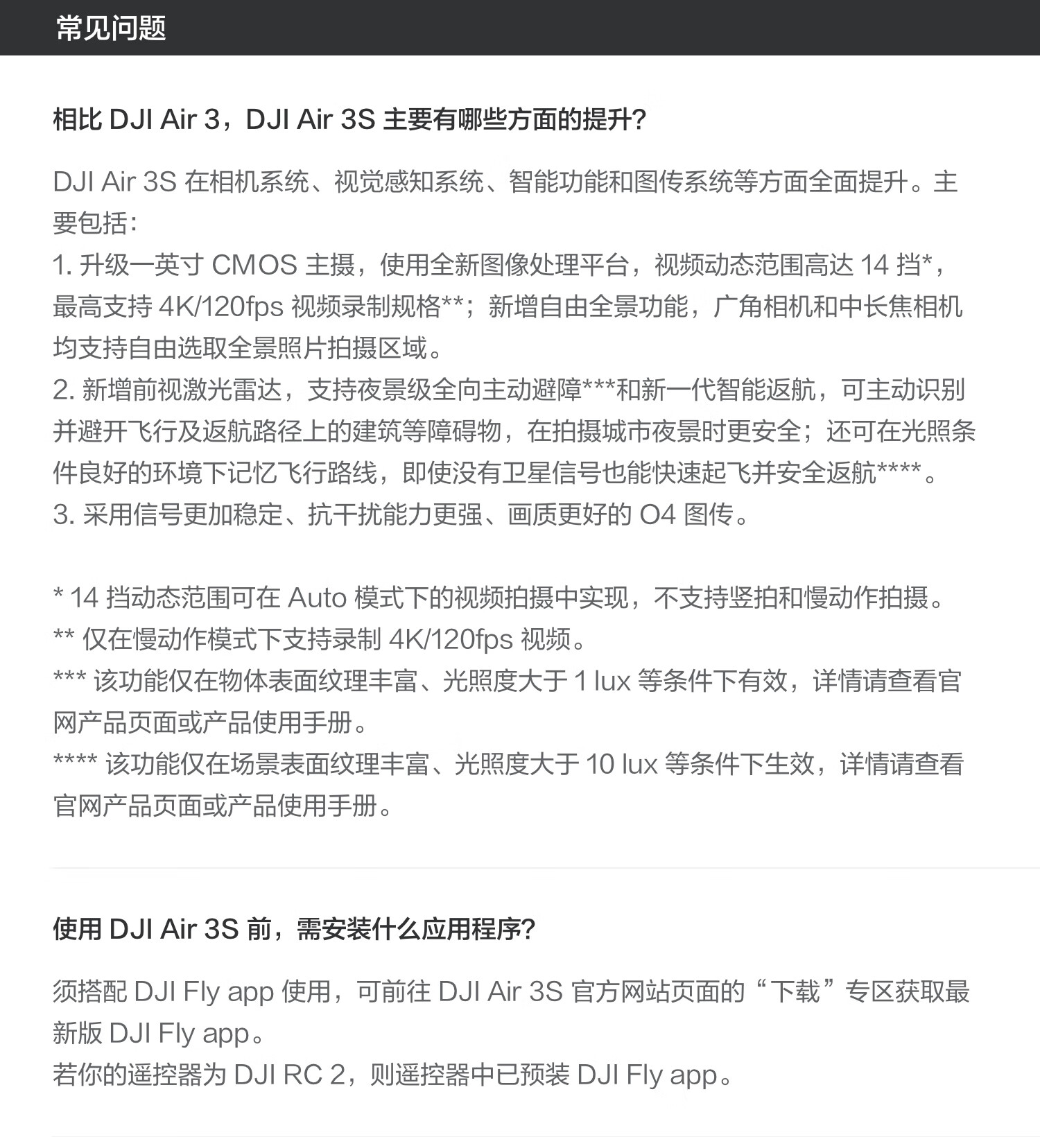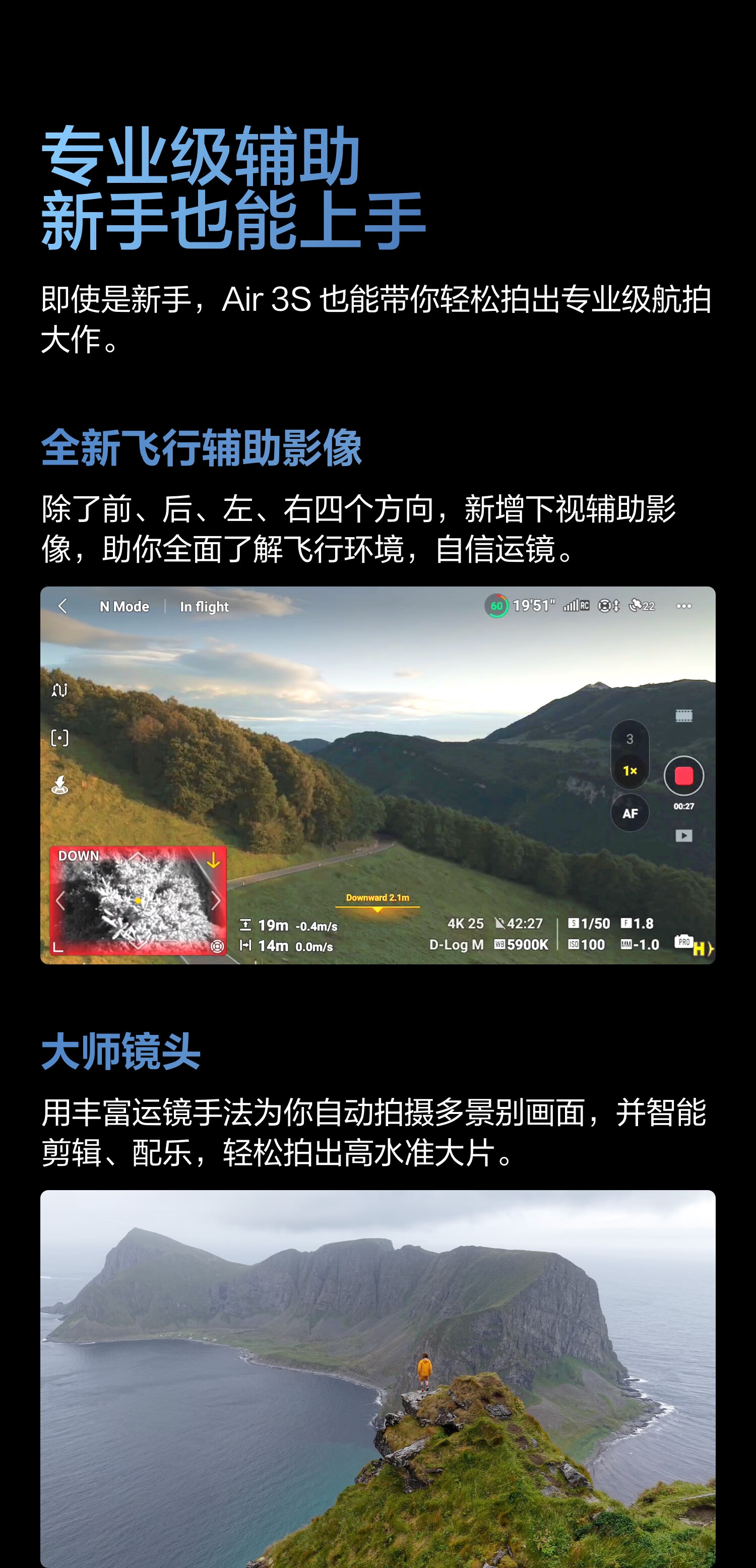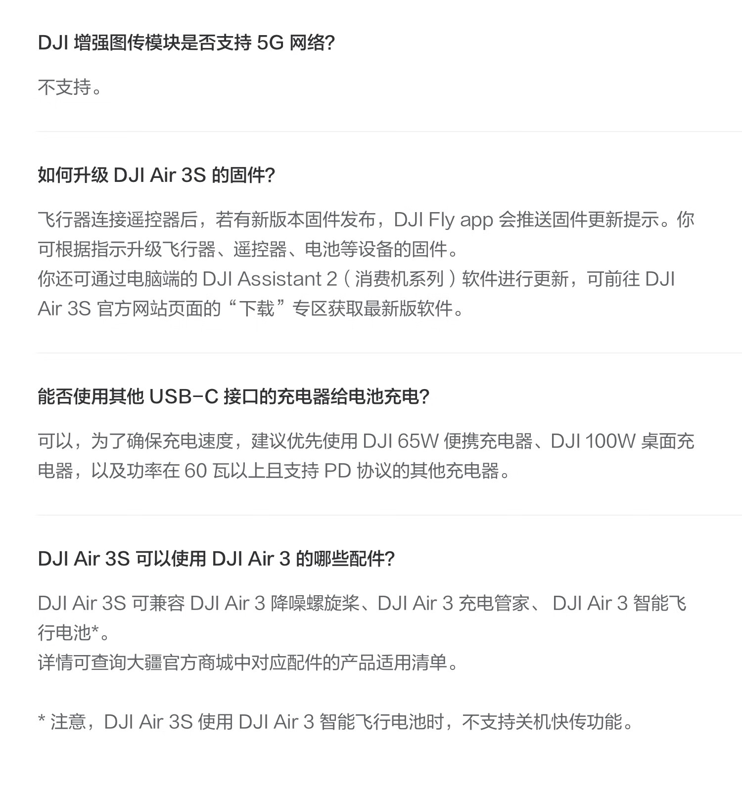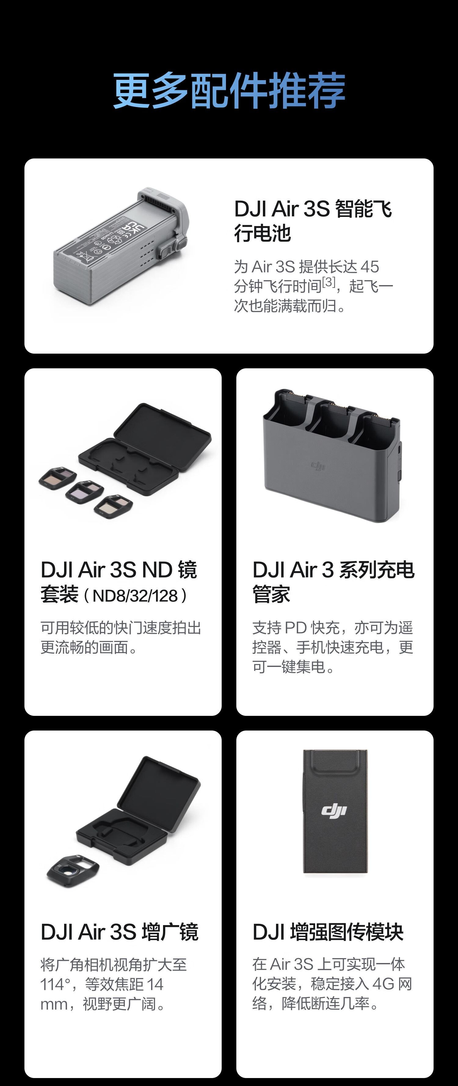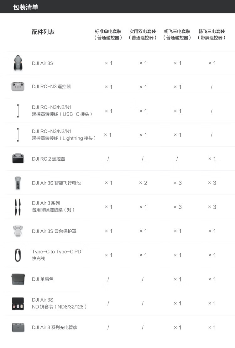 包装清单  :   DJI Air 3S ×1 DJI RC 2 遥控器×1 DJI Air 3S 智能飞行电池×3 DJI Air 3 系列备用降噪螺旋桨(对)×3 DJI Air 3S 云台保护罩×1 Type-C to Type-C PD 快充线 ×1 DJI 单肩包×1 DJI Air 3S ND 镜套装(ND8/32/128)×1 DJI Air 3 系列充电管家×1 随心换 2 年版实体卡×1