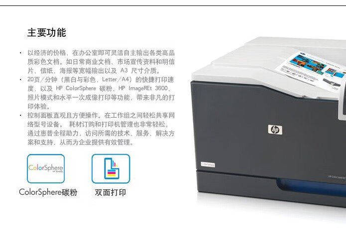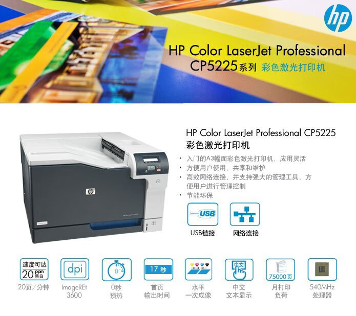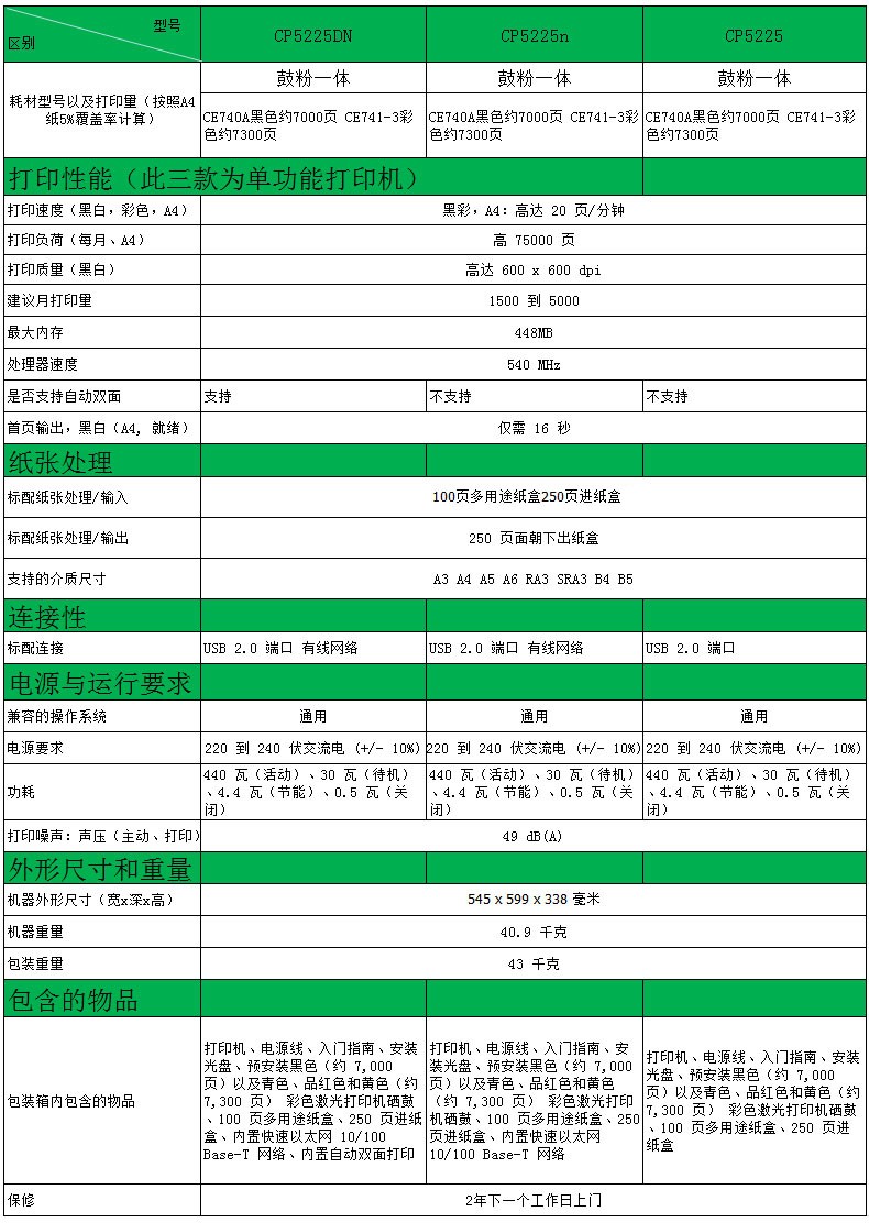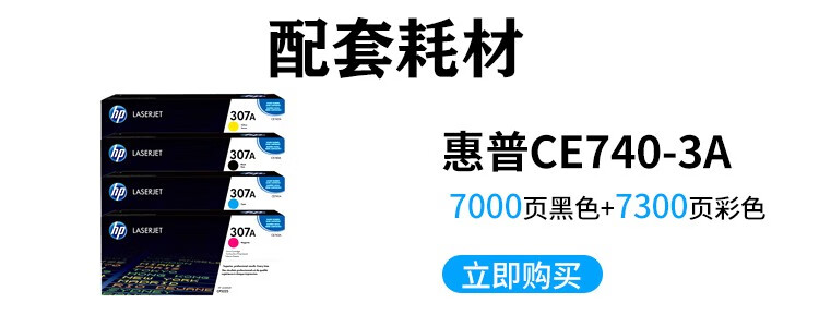 包装清单  :   惠普CP5225dn打印机、硒鼓307A黑色硒鼓约7000张,307A青/品红/黄色硒鼓约7300张(A4纸5%覆盖率计算)、USB数据线、电源线