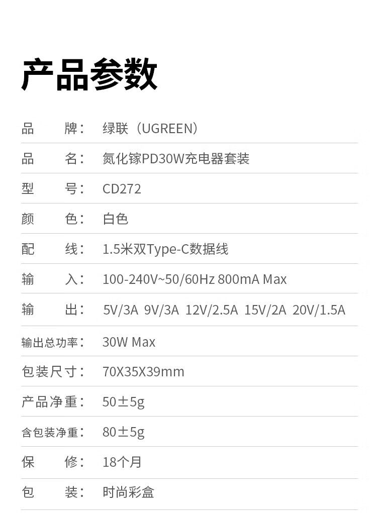 包装清单  :   30W氮化镓快充套装*1